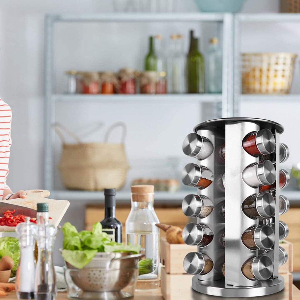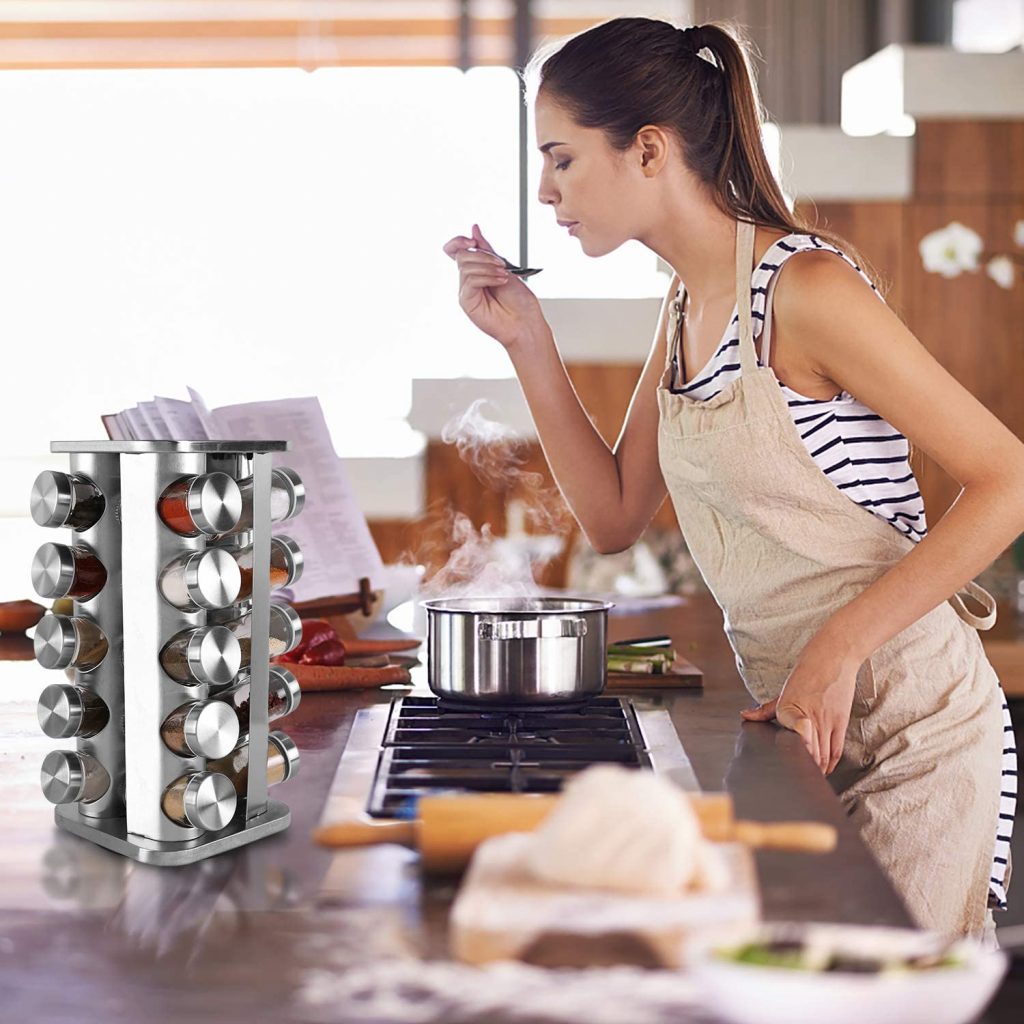 A todos nos gusta tener nuestra cocina ordenada, y si además podemos hacerlo usando complementos que ofrezcan estilo aún mejor. Para ello, nada mejor que la oferta única del Especiero Giratorio BaoWnylz (ver en Amazon). Este utensilio ideal por su elegancia ofrece también una gran comodidad por su fácil colocación, y su capacidad de 16 y 20 tarros fabricados en cristal especialmente pensado para la conservación de alimentos se considera ideal para las necesidades especieras de todas las cocinas.